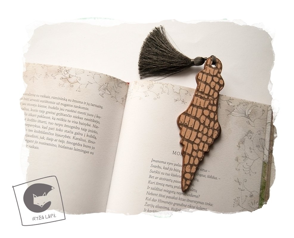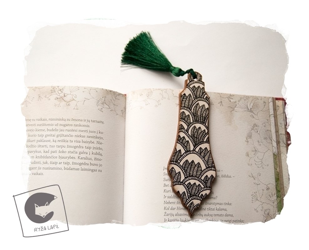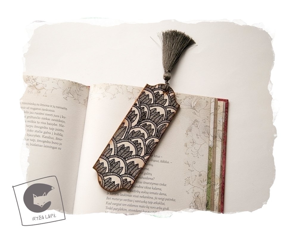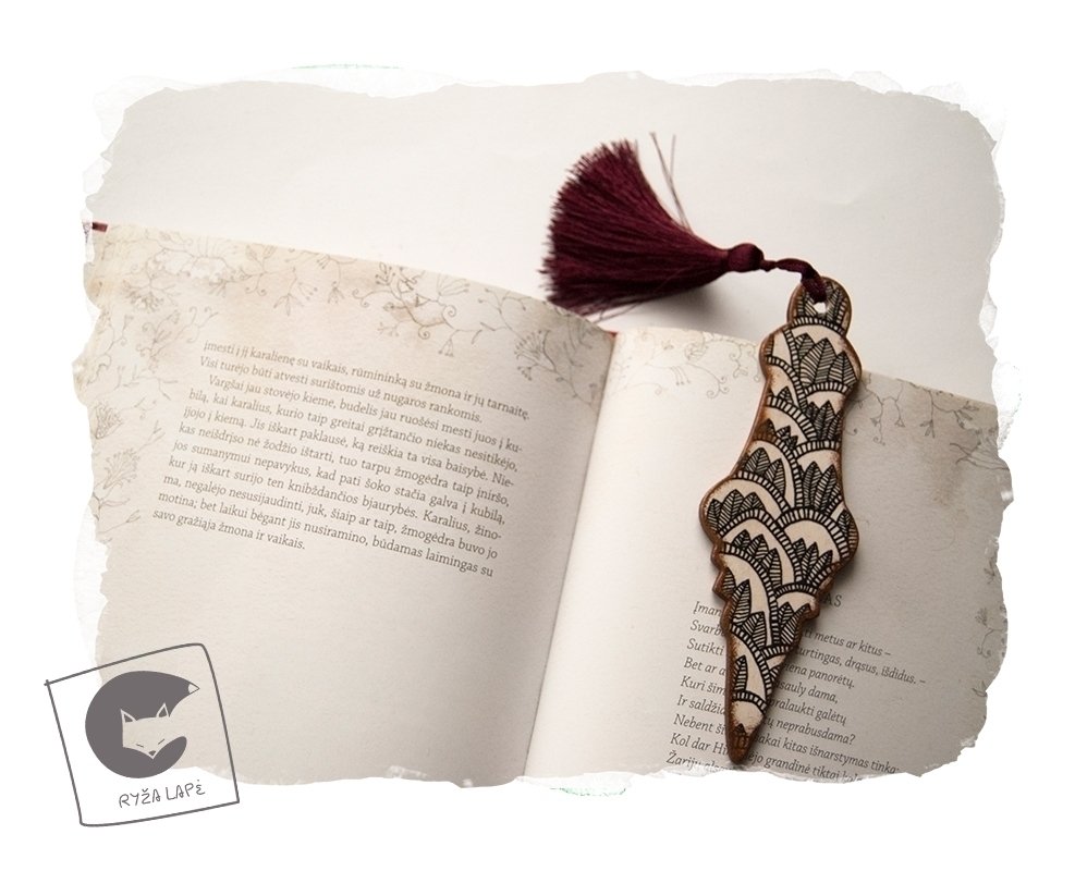 Skirtukai mediniai, įvairių formų ir raštų (išmatavimai ~15X5cm), su kutais.