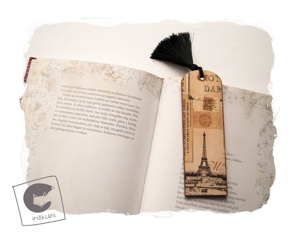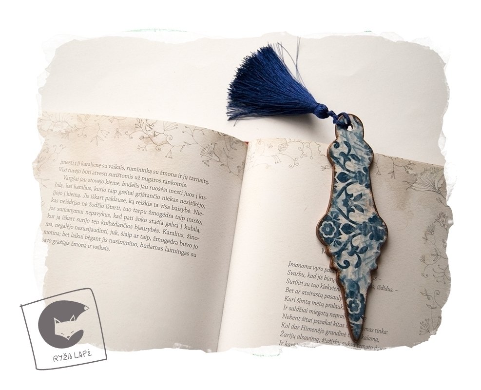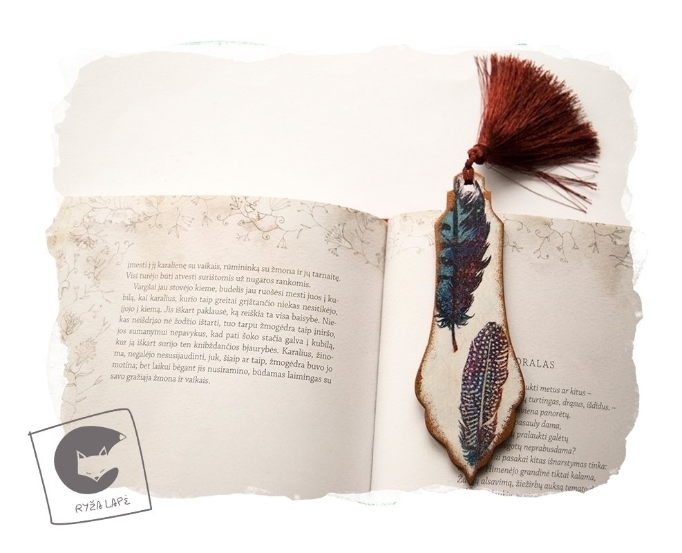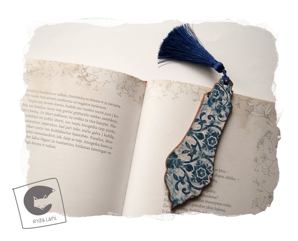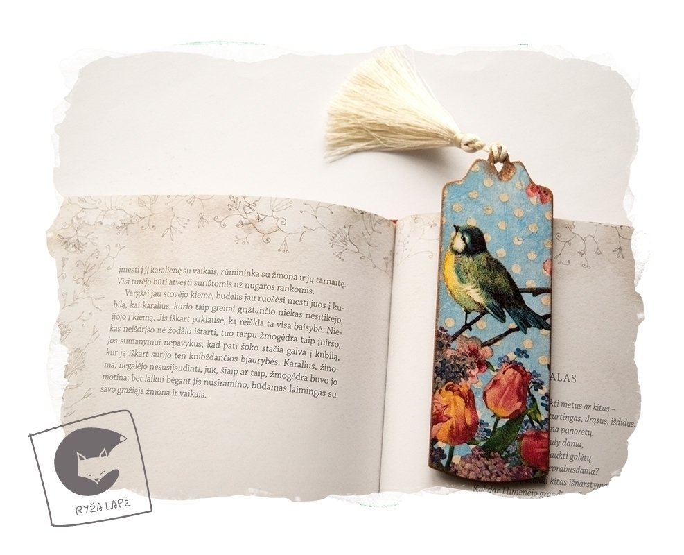 Skirtukai mediniai, įvairių formų ir raštų (išmatavimai ~15X5cm), su kutais.